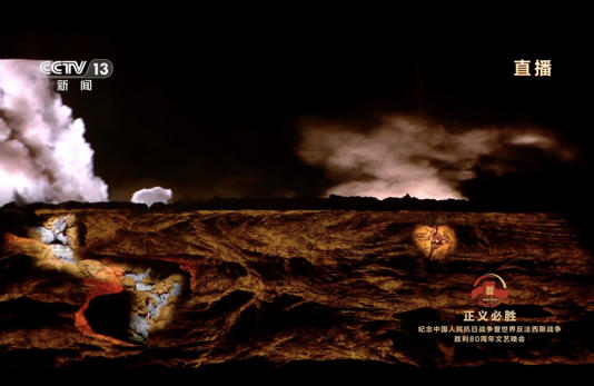 当演员沉重地“跌入”台阶之间的裂隙,形成令人心痛的南京大屠杀“万人坑”场景;当投影在演员的身上投射出干涸的大地,炮火让大地撕开血口……文艺晚会《正义必胜》中,多种视觉特效构成的舞美效果感动了无数观众。本场晚会视觉总监任冬生在接受本报记者独家采访时,讲述了视觉团队如何缔造这些震撼场面。