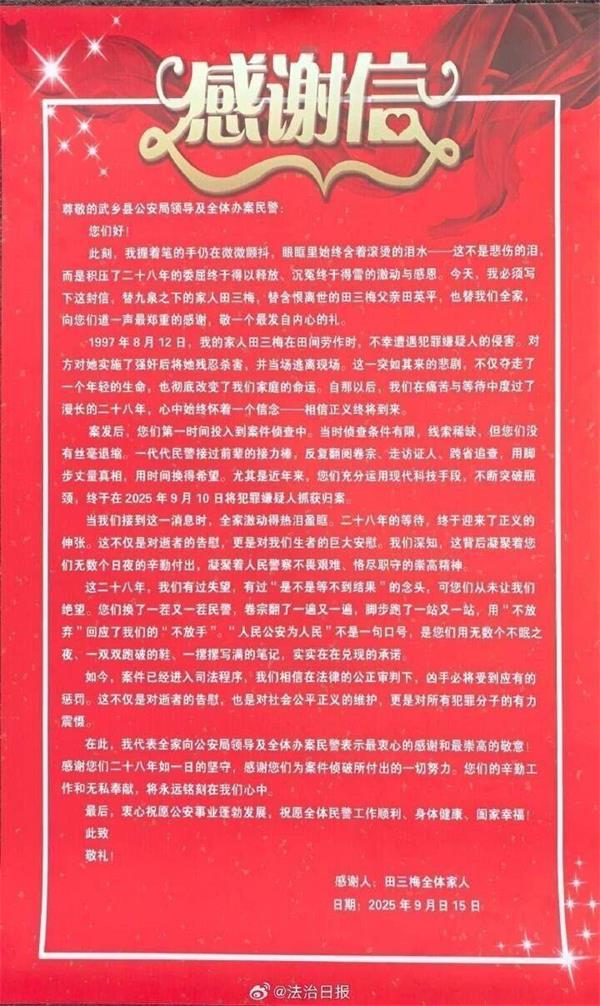 2025年9月15日上午,武乡县公安局门前,受害人家属与村干部手捧“千里缉凶护公道廿八坚守暖民心”“领导有力破积案警徽闪耀护正义”的锦旗,紧攥字字恳切的感谢信走向民警,“谢谢你们!整整28年啊!”家属代表的声音里带着抑制不住的哽咽,泪水从眼角滑落。