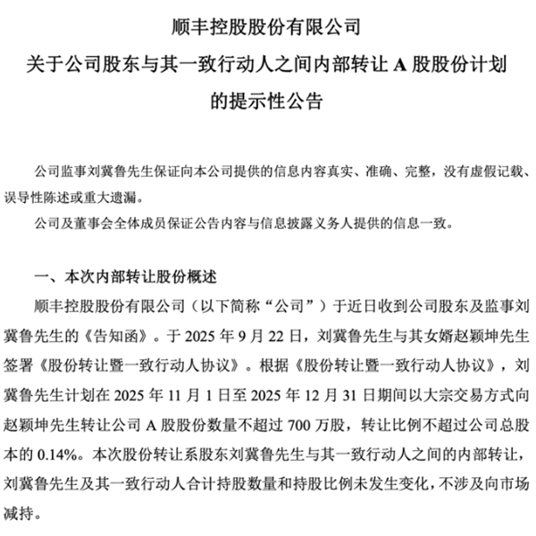 9月22日,顺丰控股发布公告称,公司于近日收到公司股东及监事刘冀鲁的《告知函》。于2025年9月22日,刘冀鲁与其女婿赵颖坤签署《股份转让暨一致行动人协议》。