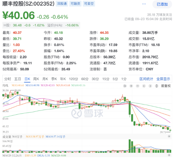 股价方面,截至9月22日,顺丰控股收报40.32元/股。若按此价格计算,本次转让金额或超2.8亿元。