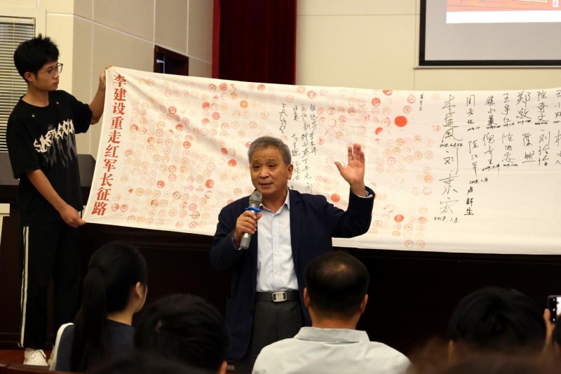 英雄叙事:在细节回溯中锚定精神坐标 宣讲中,李建设没有停留在路线与里程的铺陈,而是将历史的聚光灯打向了具体的英雄个体。 当他讲到徐向前元帅在鄂豫皖苏区反“围剿”斗争中的英明指挥时,充分彰显了红四方面军总指挥的雄才大略变得清晰可感。更令人动容的是,他深情回忆起大别山根据地早期的政治保卫局局长卢光和。这位早年离家寻求真理的革命者,从率先响应毛泽东“群众路线”号召,到在艰苦战斗中保卫红色政权成长为根据地重要领导,在极端环境下建立情报网络和反渗透体系,连续挫败国民党军对鄂豫皖苏区第一、第二次“围剿”。在战斗中表现突出,作战勇猛、工作能力和组织能力较强,在群众中颇有威信,率部粉碎了国民党军对鄂豫皖苏区的第三次“围剿”。他最终在1933年的徐畈突围战斗中(今光山县徐畈村),遭遇敌军包围,激战中为掩护主力部队转移身中数弹壮烈牺牲。讲述至此,李建设数度哽咽,英雄的勇毅与牺牲,穿越近九十载时光,依然能瞬间击中听者的心房。 这种情感的冲击力,源于真实细节的力量。革命先辈后代们——包括徐向前、王树声、陈昌浩、卢光和、刘瑞龙、任弼时、徐海东、万里、李德生等开国元勋的后代——的联名签名,不仅是对李建设夫妇壮举的敬佩,更是一种历史的相互印证与精神的隔代传承和发扬。它构成了一条从历史延伸到当下的、活的传承链。