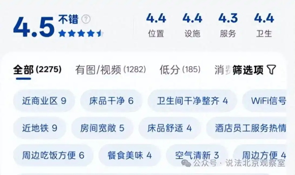 企查查信息显示,涉事酒店为重庆万驰酒店管理有限公司富力艾美酒店分公司,成立于2018年1月4日。值得关注的是,该酒店曾于2024年10月29日因违反大气污染防治管理制度,被重庆市南岸区生态环境保护行政执法支队处以5000元罚款。 在主流消费评价平台上,该酒店的口碑呈现一定差异。美团平台显示其综合评分为4.5分,其中位置、设施、卫生评分均为4.4分,服务项评分为4.3分。