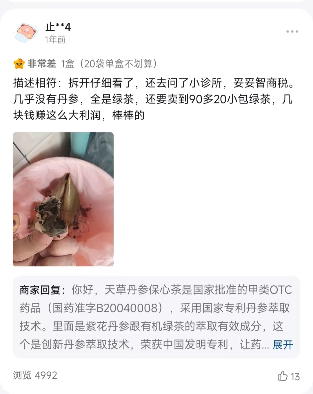 - 成分与性价比争议:有消费者拆开茶包后发现,内容物以绿茶为主,丹参占比极低,却要卖到90多元20小包,认为这是“妥妥的智商税”,并质疑商家赚取暴利。
