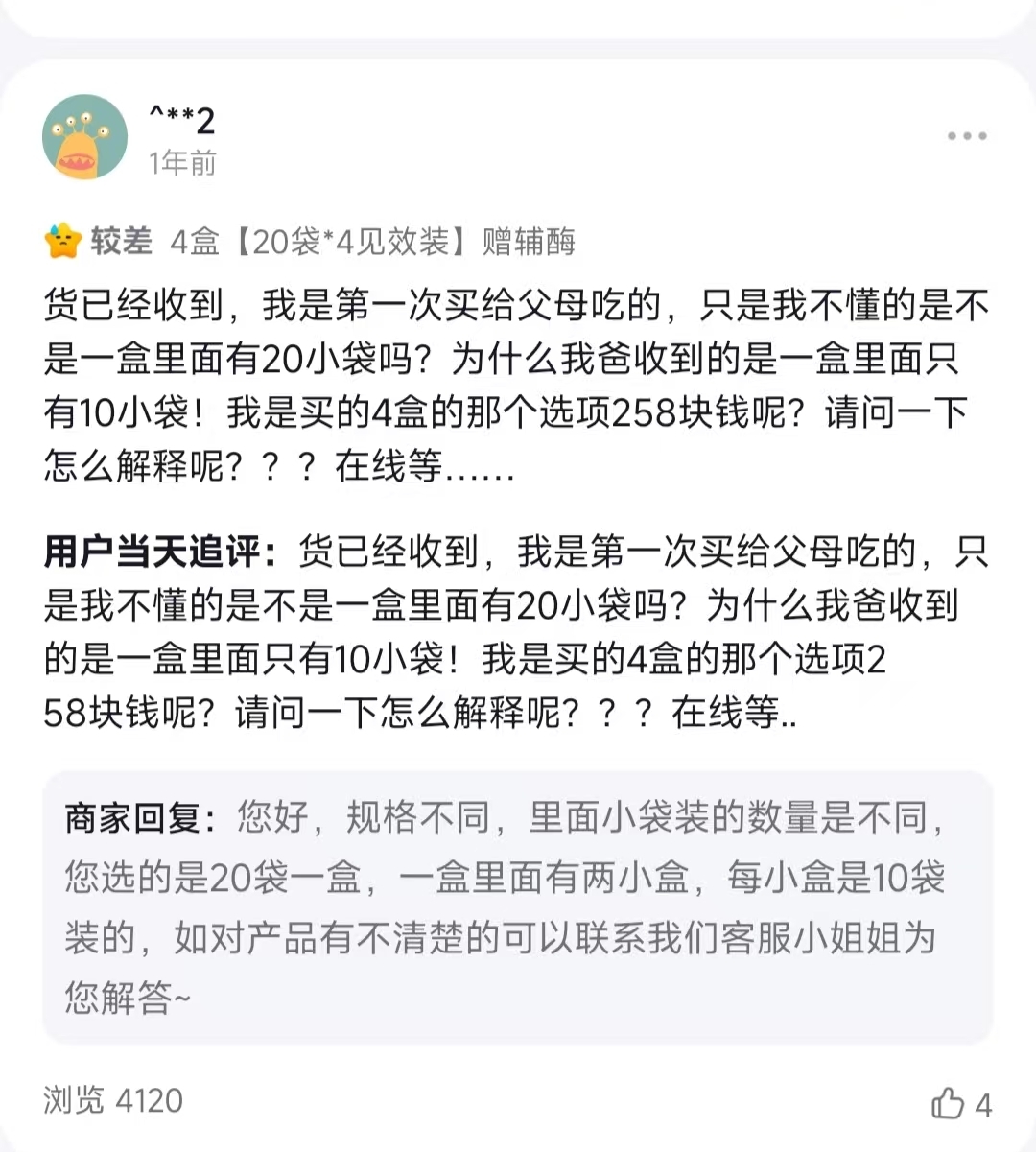 - 包装与规格混淆:有消费者购买“20袋/盒”的产品,收到的却是分为两小盒、每盒10袋的包装,导致其误以为少发了商品。商家以“规格不同”为由的解释,被指存在误导。