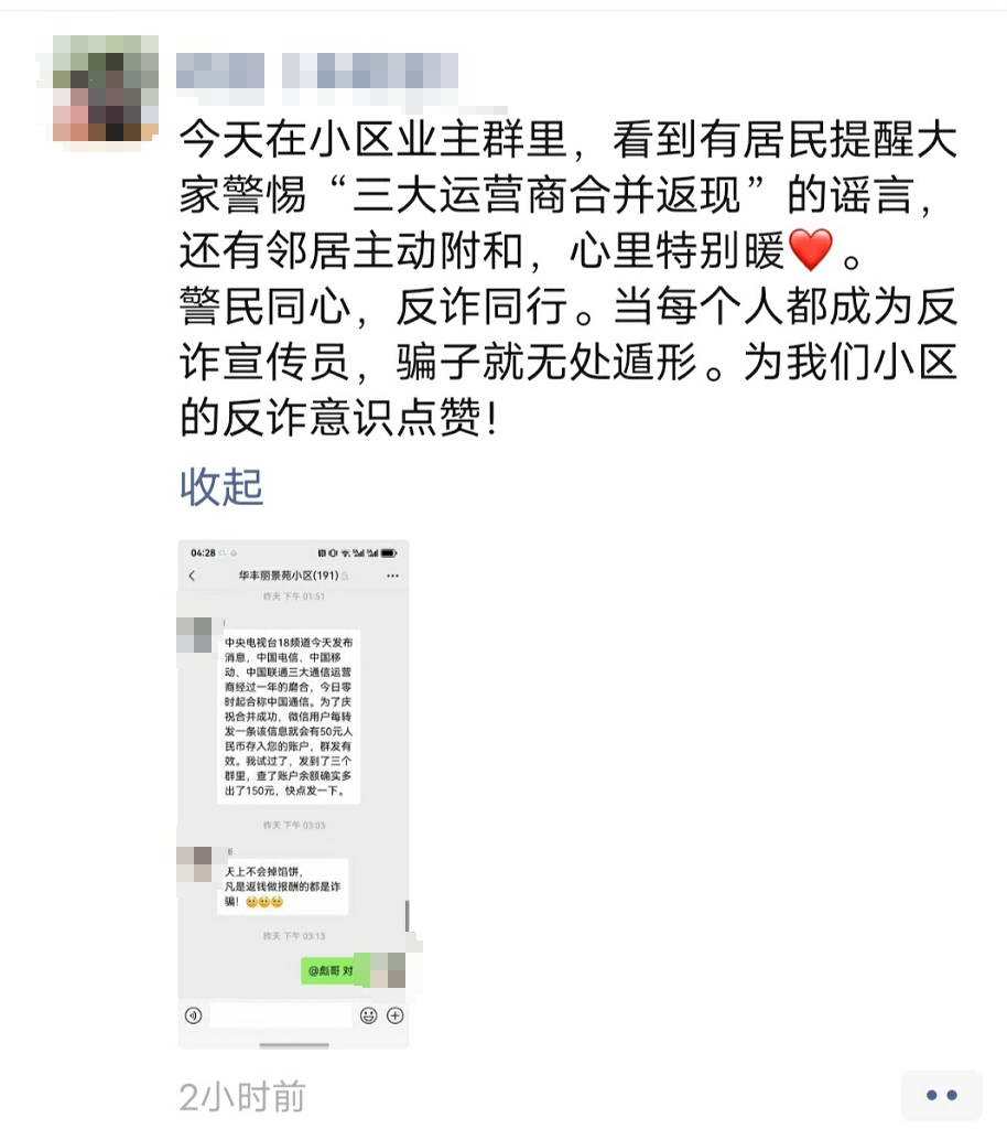 在华丰社区,如今,社区民警的持续努力宣传已转化为社区居民的自觉行动。此次业主群内的自发提醒与积极互动,正是社区反诈意识深入人心的生动体现。从“被动接受宣传”到“主动成为宣传员”,居民们不仅自己提高了警惕,更成为守护邻里钱袋子的“前哨”。这种“警民携手、邻里互助”的模式,在春节期间构筑起一道坚实的社区防骗屏障。