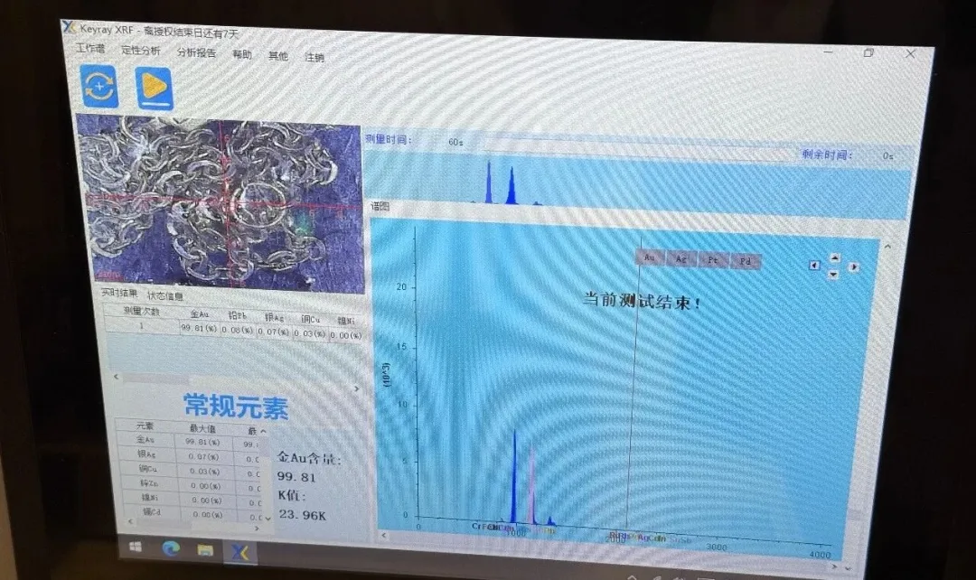 在店员的陪同下,经宝山龙湖天街B1楼某回收平台的黄金检测仪测试,两次结果均显示,项链纯度只有99.8%,还含有银、铅、铜等成分。