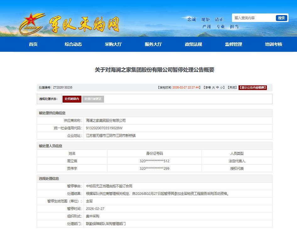 近日,知名服饰企业海澜之家因“中标后无正当理由拒不签订合同”,被联勤保障部队采购管理部门暂停全军采购资格,这一处罚不仅是对企业失信行为的有力惩戒,更折射出公共采购领域对契约精神的刚性要求。