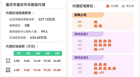 区域服务中心分为省级、市级、县级三个级别,负责对应区域的市场运营。服务中心的代理设有5GP、4GP、3GP、2GP、LP 五个级别,均需要投资者花费数万元获得代理资格。
