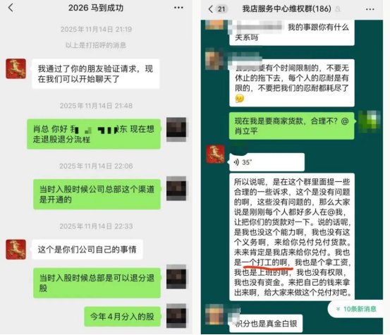 不过,与用户焦虑相反的是“上市顺利推进”的利好消息。还是在这个月,我店在杭州举行上市辅导机构签约大会,宣称正稳步迈向 2026 年 7 月的港股上市。网传的截图显示,一个备注名为“湖北省唐总”的人在群聊中表示,拥有 5 万个积分以上的商家账号或消费账号,可以花费10 万元现金或者 5 万抵用券获得“C 轮股权”。他建议 :“打 5 万元现金,预订 10 万股份,机不可失,时不再来!”