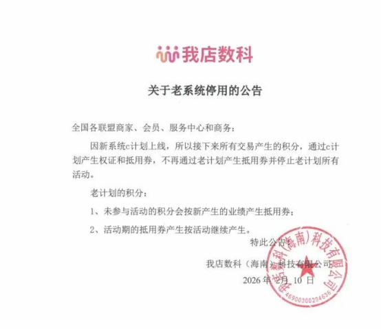2026 年 2 月 15 日,一则消息传来:我店平台运营权已全面委托给海南新畅太供应链管理有限公司。这家公司成立于 2026 年 1 月 7 日,其在 2 月 9 日前的法定代表人为梁伟,恰好和我店数科的法定代表人同名。对我店平台运营权变更一事,客服只有一句格式化的回复 :“没有收到(回复的)通知,等公告。”