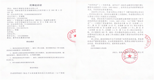 目前该作品著作权人为丰博源公司,作者允许该公司以自身名义向侵权方主张权利。 去年丰博源公司发现,2009年第2期由机械职业教育期刊发表的署名为明某的《学习动机的形成与家庭教育》(ISSN:1007-1776)(以下简称“侵权作品”)一文侵犯了原告著作权。侵权作品中第54页(左侧第1-3行),第55页(左侧第15-35行,右侧第20-30行)部分内容与权利作品中第55页(左侧第16-27行,右侧第1-7行),第56页(左侧第36-38行,右侧第1-3行、第7-14行)部分内容存在一致,共计重复约805字。