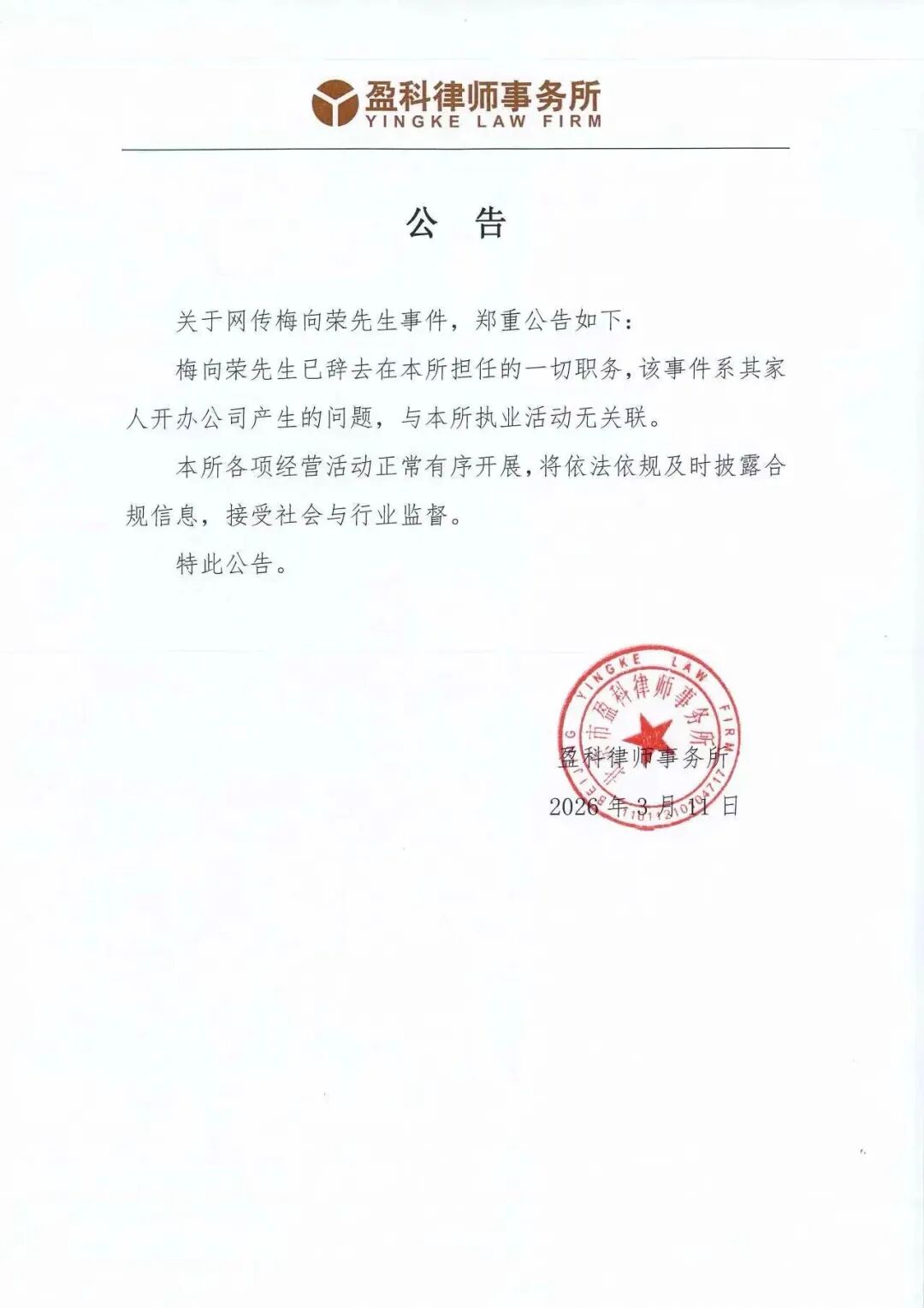 近日,一起涉及超过2万人员工的“全球头部律所负责人风波”引发社会广泛关注。3月11日,有关北京市盈科律师事务所(下称“盈科律所”)负责人梅向荣涉嫌挪用律师费用进行外部融资及违规担保的传言在网络上迅速传播,传闻涉及的融资金额高达40亿元。当晚,盈科律所发布声明,宣布梅向荣已辞去在该所的所有职务,并强调“该事件系其家人开办公司产生的问题,与本所执业活动无任何关联”。