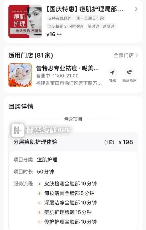 在本地生活服务平台,“蕾特恩”投放了大量低价体验套餐。一项标价10元或16.8元的“局部祛痘+毛孔清洁”团购项目,累计销量常达数万份。多家门店综合评分在4.7分以上,评价区充斥着“服务热情”“效果明显”等好评。
