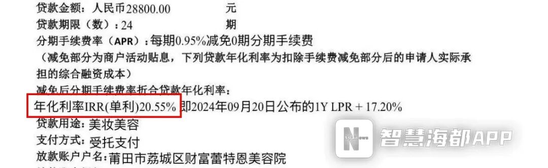 去年8月,在维权律师的帮助下,林女士通过贷款机构的App,才查询到那份电子合同。根据合同截图,这笔贷款金额为28800元,年化利率(单利)高达20.55%。每月需还款1473元,分24期。此外,之前办理的支付宝“先用后付”每月还需还款483元。两笔加起来,加上利息后总额超4万元,她每月要还近2000元。而主流银行消费贷年化利率多在 3.0% 至 6.0% 之间。