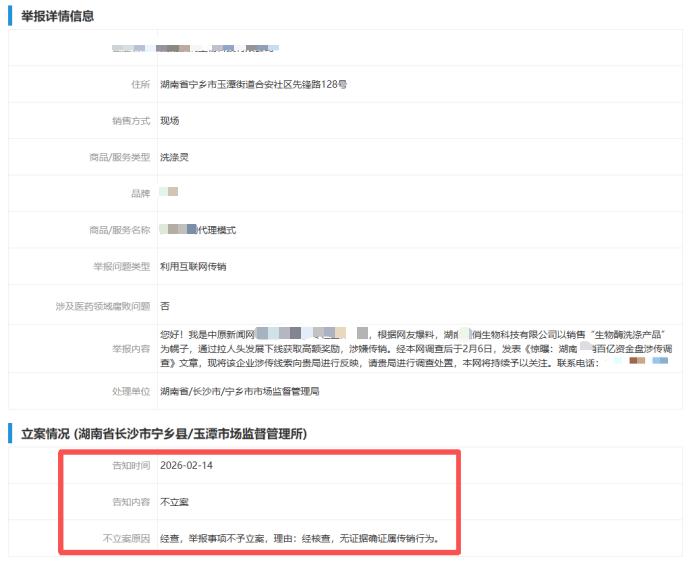 不仅如此,2月12日本网工作人员通过全国12315平台,向该企业属地监管部门宁乡市市场监督管理局实名举报,明确要求对企业涉嫌传销问题依法核查,并主动预留联系方式,配合监管部门调查取证。