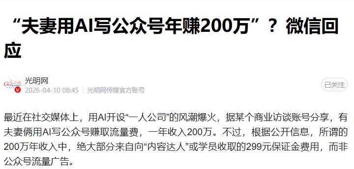 最近,“AI一人公司”在社交平台彻底刷屏,一对夫妻靠AI写公众号年入200万的说法,更是掀起了全网热议。可看似光鲜的赚钱神话,背后早已变味:所谓的高额收入,并非来自公众号流量广告,大多是靠收取学员保证金得来,而这场AI写作热潮,也终于引来平台的正式监管。