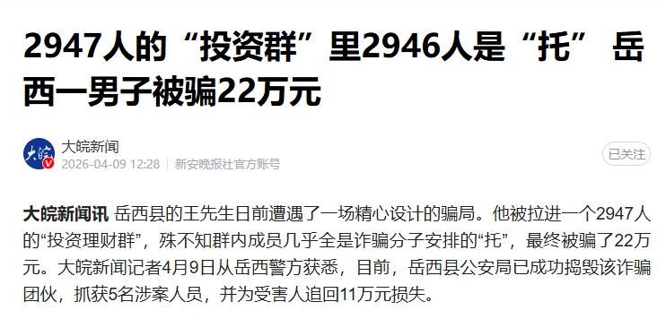 素材来源:大皖新闻2026年4月9日发布《2947人的“投资群”里2946人是“托” 岳西一男子被骗22万元》