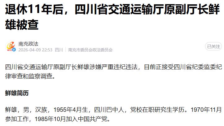 2026年4月9日,四川省纪委监委发布通报,四川省交通运输厅原副厅长鲜雄涉嫌严重违纪违法,正接受纪律审查和监察调查 。这位1955年出生、2015年5月正式退休的71岁老干部,直至被查时已退休11年,其落马再次击碎“退休就是平安着陆”的幻想,彰显反腐永远没有“休止符” 。