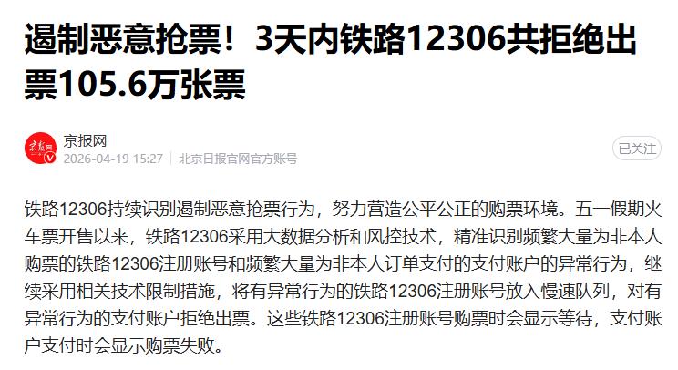 4月16日0时至18日24时3天时间内,铁路12306已累计将564万笔交易放入慢速队列,对70.4万笔交易拒绝出票,共拒绝出票105.6万张票,有力遏制了恶意抢票行为。