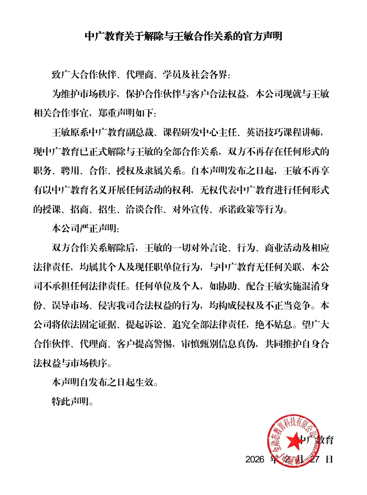 更令人费解的是,今年2月27日,中广教育相关微信群发布声明,称已解除与时任副总裁、课程研发中心主任、英语技巧讲师王敏的全部合作关系,声明王敏此后无权再以中广教育名义开展授课、招商、招生等任何活动,其个人行为与公司无关。但工商信息显示,陕西中广全动态教育科技有限公司的法定代表人正是王敏,自家公司“开除”法人的操作荒诞离奇。截至目前,在中广教育考学平台小程序内,“王敏专家领衔”的宣传字样仍未撤下,相关信息真实性暂时无法核实。