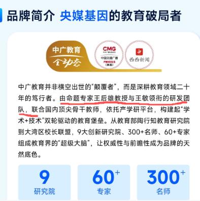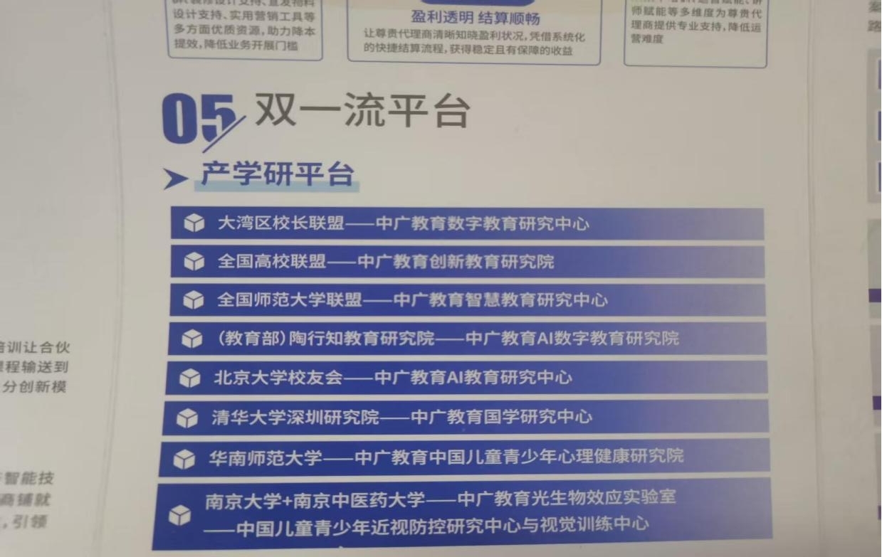 在其宣传资料中,中广教育自诩使命为“让家家拥有英才成长赋能系统”,通过培训让各行各业从业者变身教育“专家”,依托所谓“全动态智能中高考”“智教云平台”等IP,为代理商搭建“刚需、低门槛、零风险、易落地”的创富生态,更声称具备深厚文化底蕴、先进经营理念、一流专家团队与“双一流”产学研平台。然而记者调查核实,其大肆宣传的“双一流平台”,并未在工商、教育及民政等主管部门备案,纯属虚构背景、虚张声势的“山寨平台”。