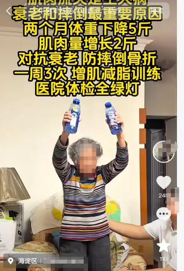 记者在网上发现,这类视频的确热度不低。比如,一位自称“80+女生”的老人发布了自己在公园锻炼的视频。只见她双手握住杠铃片,一会儿“跳起平推”,一会儿“箭步蹲侧转”,一会儿“单腿平衡推肩”,一会儿“绕颈蹲举”,动作干脆利索,而且看起来似乎毫不费力。